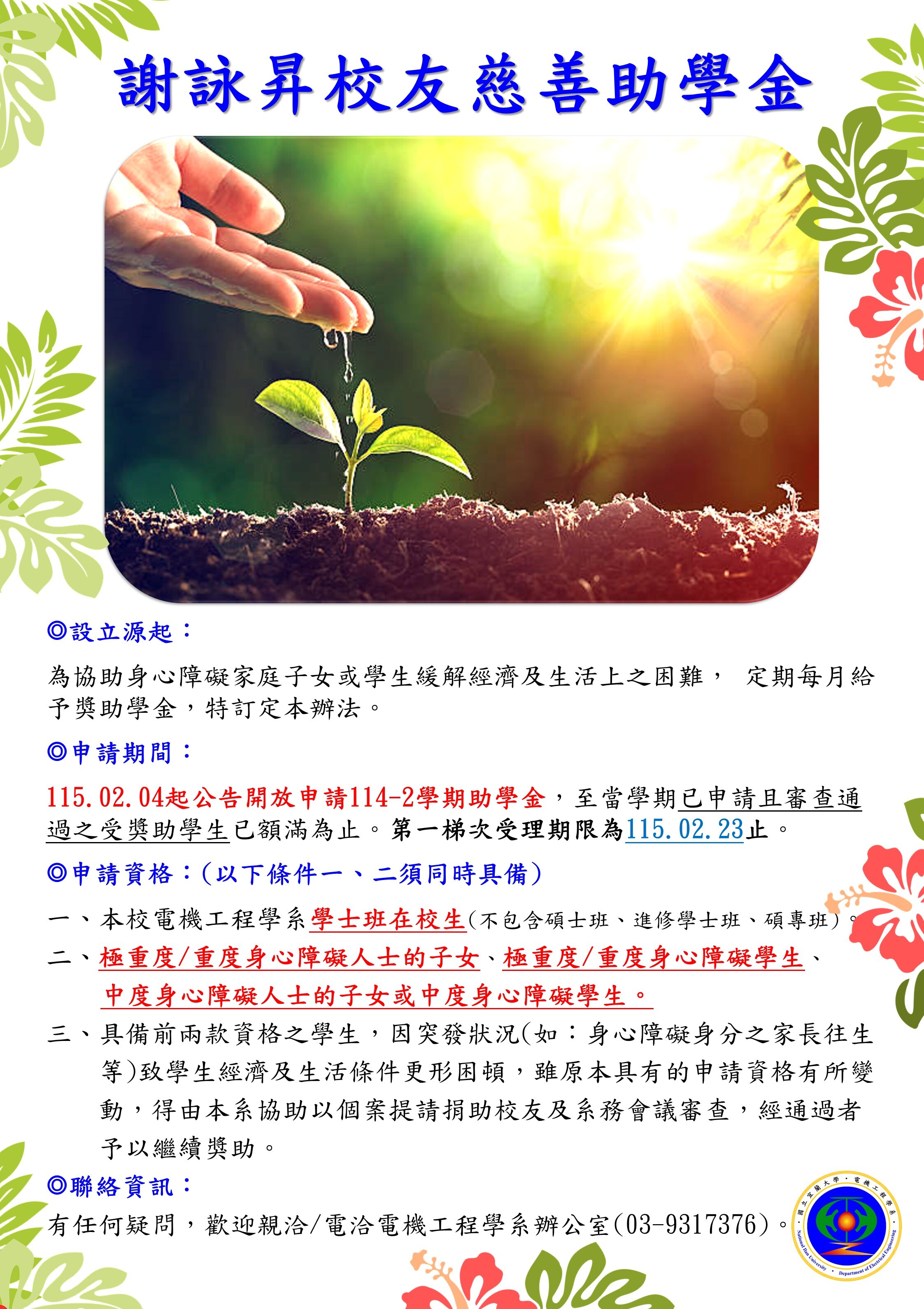 四、餘請詳閱國立宜蘭大學電機工程學系謝詠昇校友慈善獎助學金申請辦法(點我下載)。