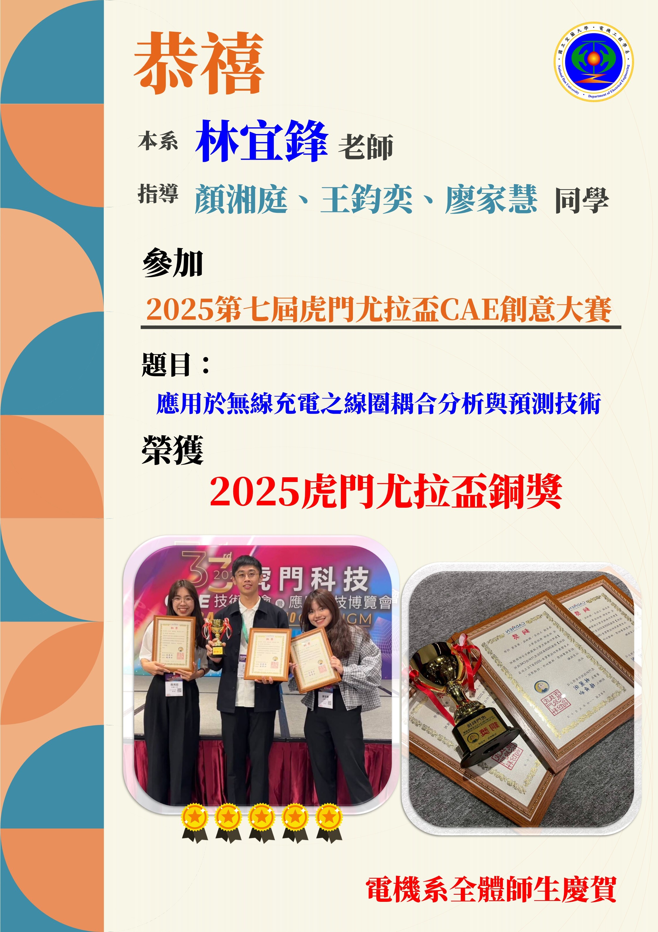 恭禧本系林宜鋒老師 指導本系 顏湘庭、王鈞奕、廖家慧同學等人 參加 2025第七屆虎門尤拉盃CAE創意大賽-銅獎
