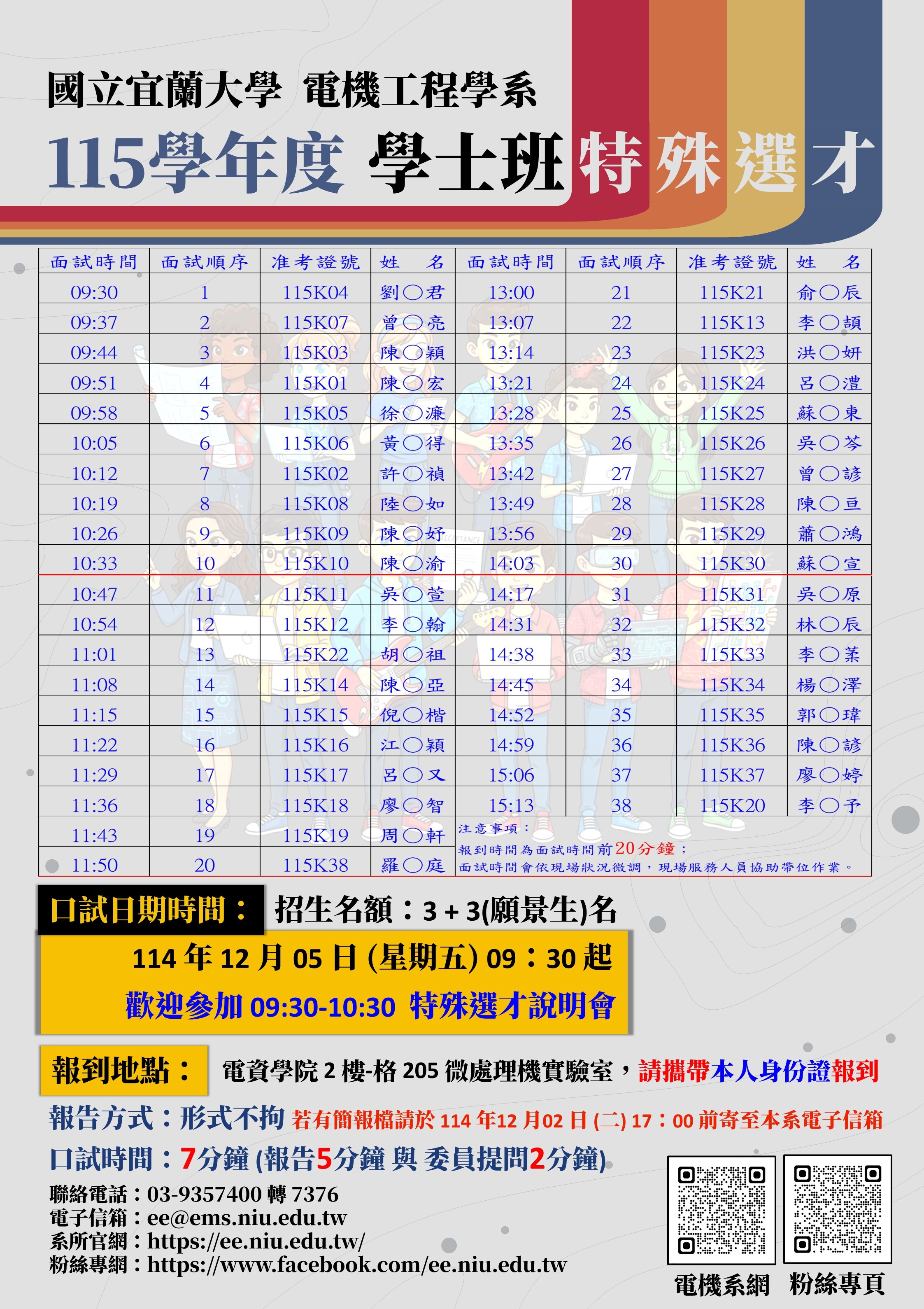 國立宜蘭大學電機工程學系115學年度特殊選才入學面試時間表暨注意事項說明:
