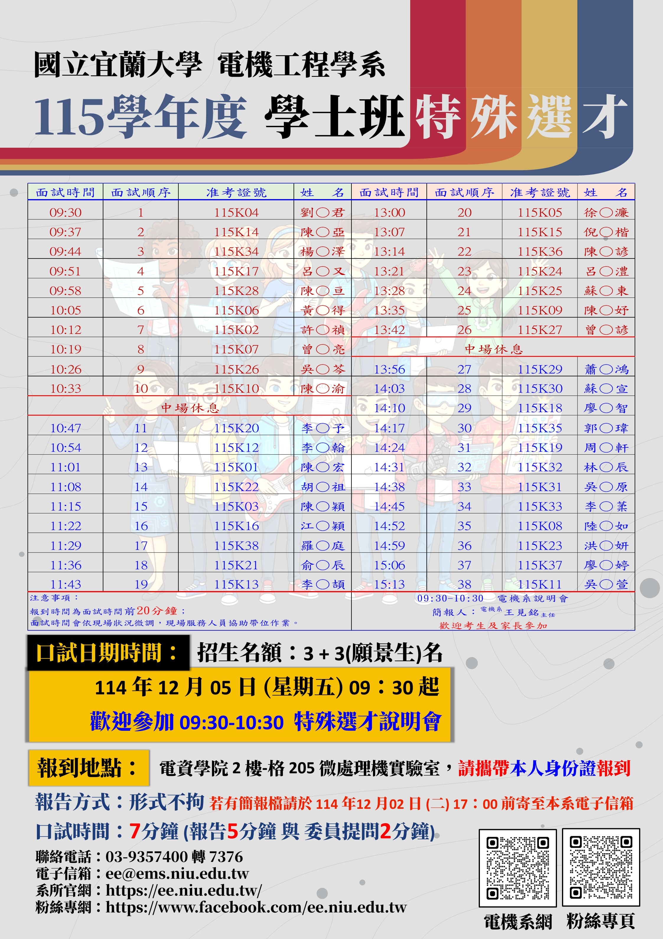 國立宜蘭大學電機工程學系115學年度特殊選才入學面試時間表暨注意事項說明-114.12.03 AM10:00更新版