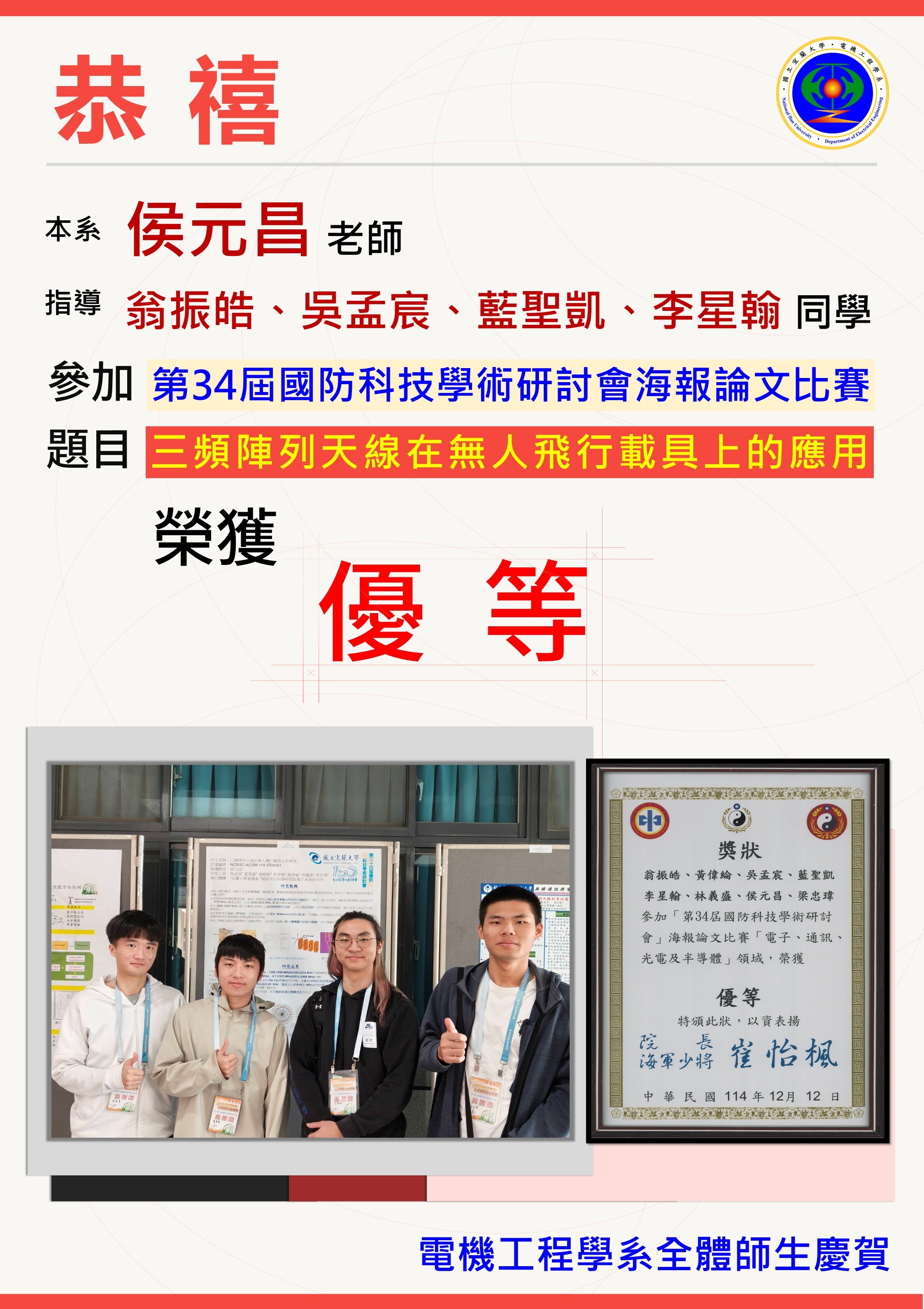 恭禧本系學生參加「第34屆國防科技學術研討會」海報論文比賽 「電子、通訊、光電及半導體」領域榮獲優等獎